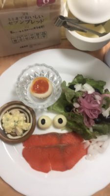 たらこ唇のスモークサーモン、チーズにカレンズ、野菜サラダ、玉子サラダ、煮玉子。