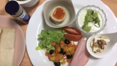ハムエッグ、アイスプラントに人参の甘煮とプチトマト、レタスとナッツのサラダ、ヨーグルトにプルーンと冷凍柿。