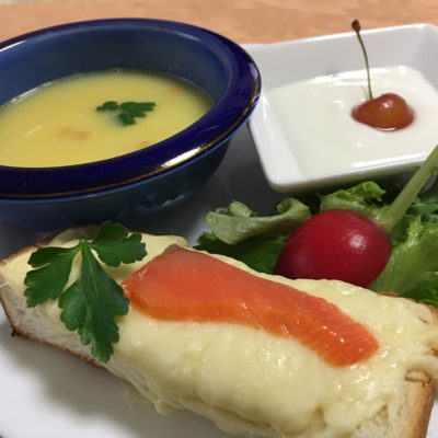 スモークサーモンのチーズトースト、コーンポタージュ、野菜サラダ、ヨーグルトと冷凍佐藤錦。
