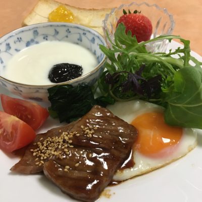 カルビ焼肉、目玉焼き、リーフサラダにブロッコリーとトマト、ヨーグルトとプルーン、いちご。