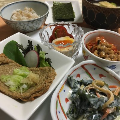 じゃこ天の炙りとリーフサラダ、若布の白和え、煮玉子とプチトマト、キムチ納豆。