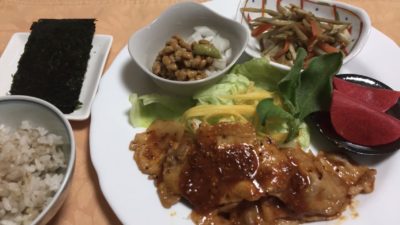ポークチャップ、レタスに黄人参のピクルスとアイスプラント、紅大根のピクルス、金平ごぼう、玉葱納豆。