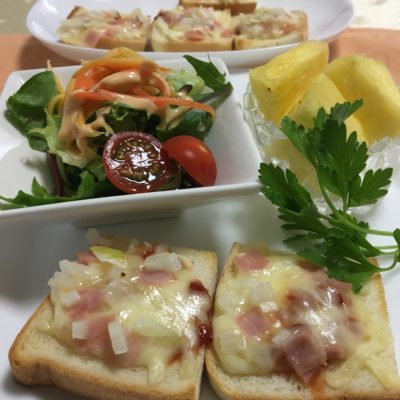 ベーコンピザトースト、野菜サラダ、パイナップル。