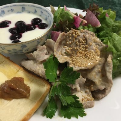 豚しゃぶサラダ、ヨーグルトと冷凍ブルーベリー。