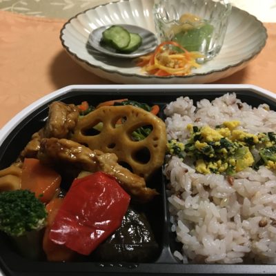 管理栄養士監修のお弁当、人参のピクルス、お刺身こんにゃくの酢味噌掛け、自家製胡瓜の糠漬け。