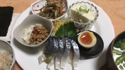 しめ鯖、人参のピクルス、煮玉子、冷や奴、金平ごぼう、玉葱納豆。