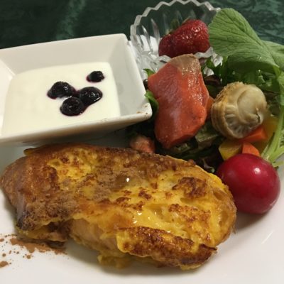 フレンチトースト、厚切りスモークサーモンとホタテの海鮮サラダ、プチトマト、ヨーグルトとレーズン、いちご。
