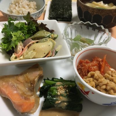 鮭カマの塩焼き、青菜のお浸し、コンキリエのサラダとレタス、刺身こんにゃくの酢味噌掛け、キムチ納豆。