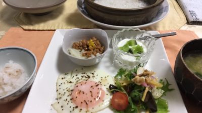 目玉焼き、ナッツサラダとプチトマト、ヨーグルトとキウイフルーツ、玉葱納豆。