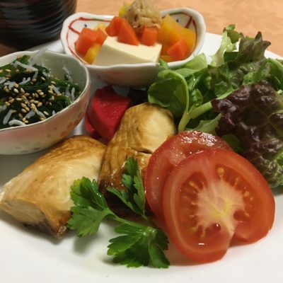 サクラマスのソテー、レタスとトマト、紅大根のピクルス、青菜のシラス和え、冷や奴。