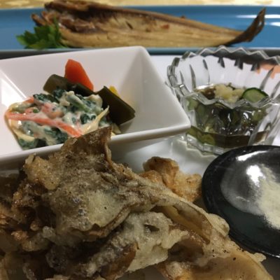舞茸天麩羅、ほうれん草の白和え、胡瓜ともずくの生姜酢、ホッケの開き焼。