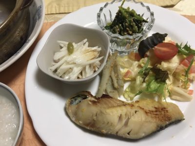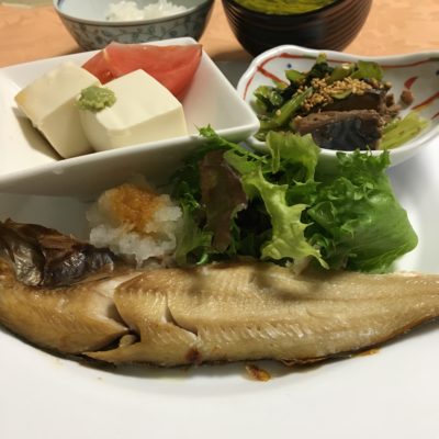ホッケの開き焼、レタスと大根のおろし、小松菜の鯖味噌和え、冷や奴とトマト。