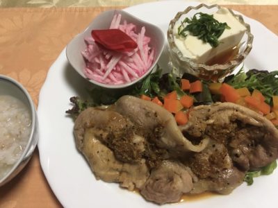 豚の生姜焼き、レタスと人参のサラダ、千切り長芋の甘酢和えと紅大根のピクルス、冷や奴。