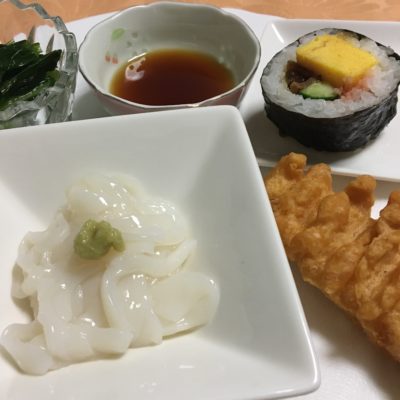 イカそうめん、クリスビーチキン、太巻き寿司、青菜のお浸し。
