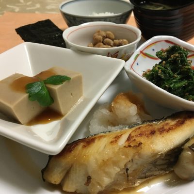 銀タラみりん焼、ほうれん草の胡麻和え、胡麻豆腐、納豆。