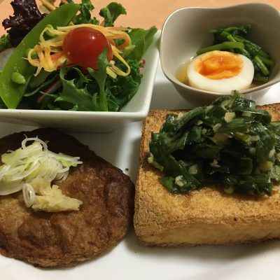 焼き豆腐のニラソース、焼さつま揚げ、青菜のお浸しと出汁玉子、野菜サラダとピクルス。