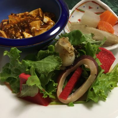 麻婆豆腐、海鮮サラダ、根菜の煮物。