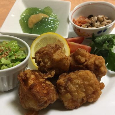 鶏の唐揚げ、レタスとトマト、キャベツの胡麻和え、お刺身こんにゃくに酢味噌、キムチ納豆。