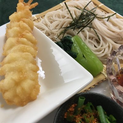 海老の天麩羅、ざる蕎麦、小松菜のお浸し。