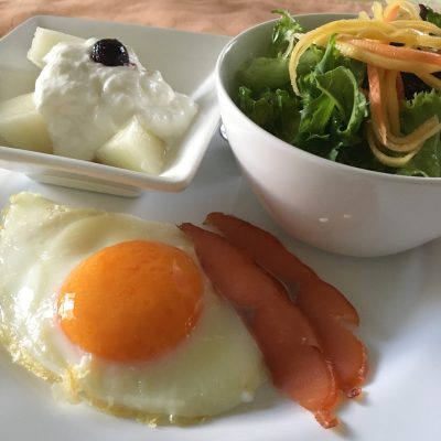 目玉焼きとスモークサーモン、野菜サラダと人参のピクルス、ヨーグルトとメロン。