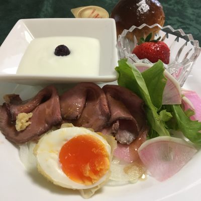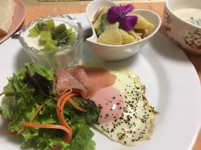 西京味噌のミルクポタージュ、目玉焼き、野菜サラダと生ハム、コンキリエのサラダ、ヨーグルトとキウイフルーツ。