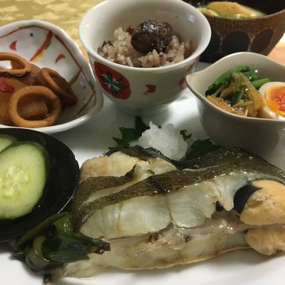 花豆ごはん、鰈の塩焼き、自家製胡瓜の糠漬け、イカと大根の煮物、小松菜とゆで玉子のエノキがけ。