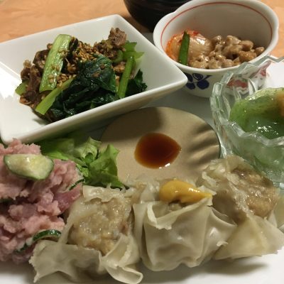 焼売、レッドムーンのポテトサラダとレタス、刺身こんにゃくの酢味噌掛け、小松菜の鯖味噌和え、キムチ納豆。