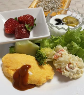 365日クッキング 1月15日の朝ごはん(丸紅ギャラリー) オムレツ、ポテトサラダ、レタスとブロッコリー、いちご、栗と黒豆のヨーグルト、チェダーチーズのシラストースト。1月15日は小正月。行事食は朝の...
