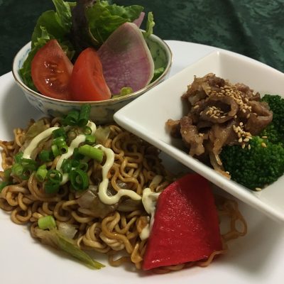 カップ焼きそばと紅大根のピクルス、ブロッコリーと焼きしゃぶ、野菜サラダとトマト。