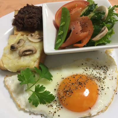 目玉焼き、マッシュルームのチーズトースト、スモークサーモンサラダ。
