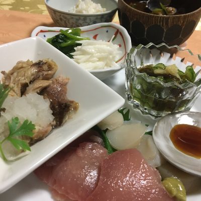 シジミの赤だし、マグロと帆立のお刺身、鯖のおろし和え、千切り長芋とほうれん草のお浸し、もずくと胡瓜の生姜酢。