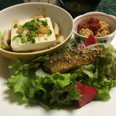 エノキ入りの温奴、鰺の甘酢サラダに紅大根のピクルス、キムチ納豆。