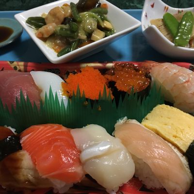 握り寿司のお弁当、八宝菜、筍の煮物とさやインゲン。