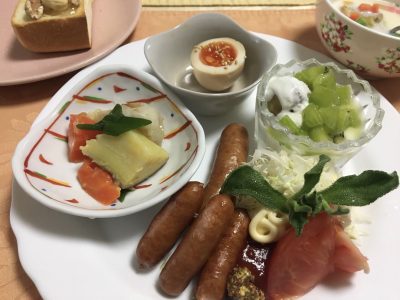 栗のミルクポタージュ、ソーセージと生ハム、千切りキャベツとアイスプラント、根菜の煮物、煮玉子、ヨーグルトとキウイフルーツ。