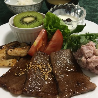カルビ焼肉、焼エリンギ、レッドムーンのポテトサラダとレタス、アイスプラントとトマト、ヨーグルトと冷凍ブルーベリー、キウイフルーツ。