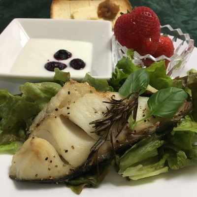 銀タラのハーブグリル、リーフサラダ、ヨーグルトと冷凍ブルーベリー、いちご。