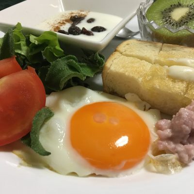 目玉焼き、レッドムーンのポテトサラダ、アイスプラントとトマト、ヨーグルトとレーズン、キウイフルーツ。