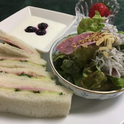 ハムサンドウィッチ、レタスとシラスのサラダ、ヨーグルトと冷凍ブルーベリー、いちご。