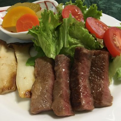 ステーキサラダ、エリンギのソテー、根菜の煮物。