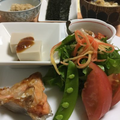 鮭カマの塩焼き、野菜サラダとトマトに人参のピクルス、胡麻豆腐、キムチ納豆。