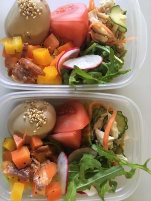 お弁当(煮玉子、ベーコンと人参のオリーブ炒め、棒々鶏サラダ、トマト、ルッコラとラディッシュのサラダ)