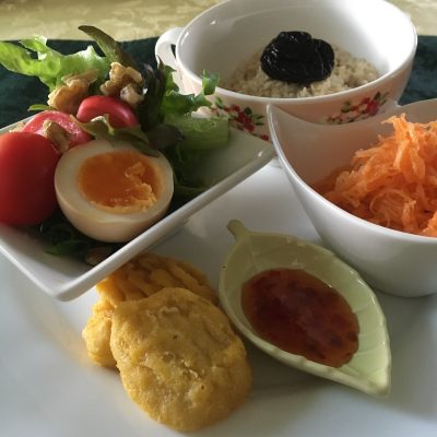 オートミール、チキンナゲット、野菜サラダと塩玉子、キャロットラペ。