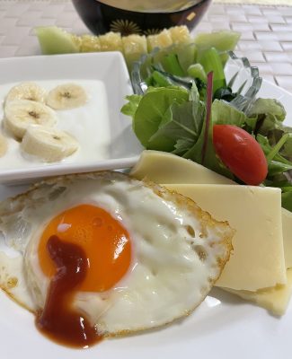 目玉焼き、ゴーダチーズとリーフサラダにプチトマト、ヨーグルトとバナナ、メロン。