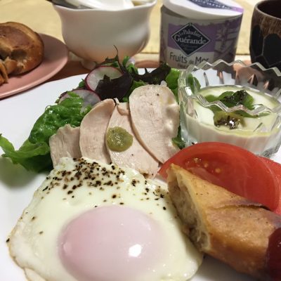 目玉焼き、チキンのチリソースと野菜サラダ、春巻きとトマト、ヨーグルトとキウイフルーツ。