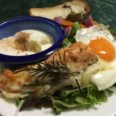 銀鮭のハーブチーズ焼き、目玉焼きと野菜サラダ、ヨーグルトとバナナ。