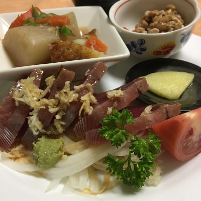 鰹のお刺身にオニオンスライスとトマト、根菜の煮物、自家製沢庵、キムチ納豆。
