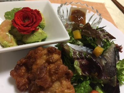 アボカドサラダとエディブルフラワー、鶏の唐揚げ、野菜サラダ、冷たいふろふき大根。