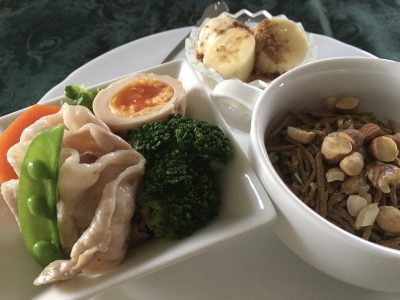 しゃぶしゃぶサラダ、シリアルにナッツ、ヨーグルトとバナナ。
