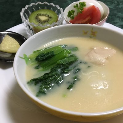 お雑煮、塩玉子とトマト、自家製沢庵、キウイフルーツ。