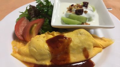 オムライス、野菜サラダとトマト、ヨーグルトとキウイフルーツにナッツとドライフルーツ。